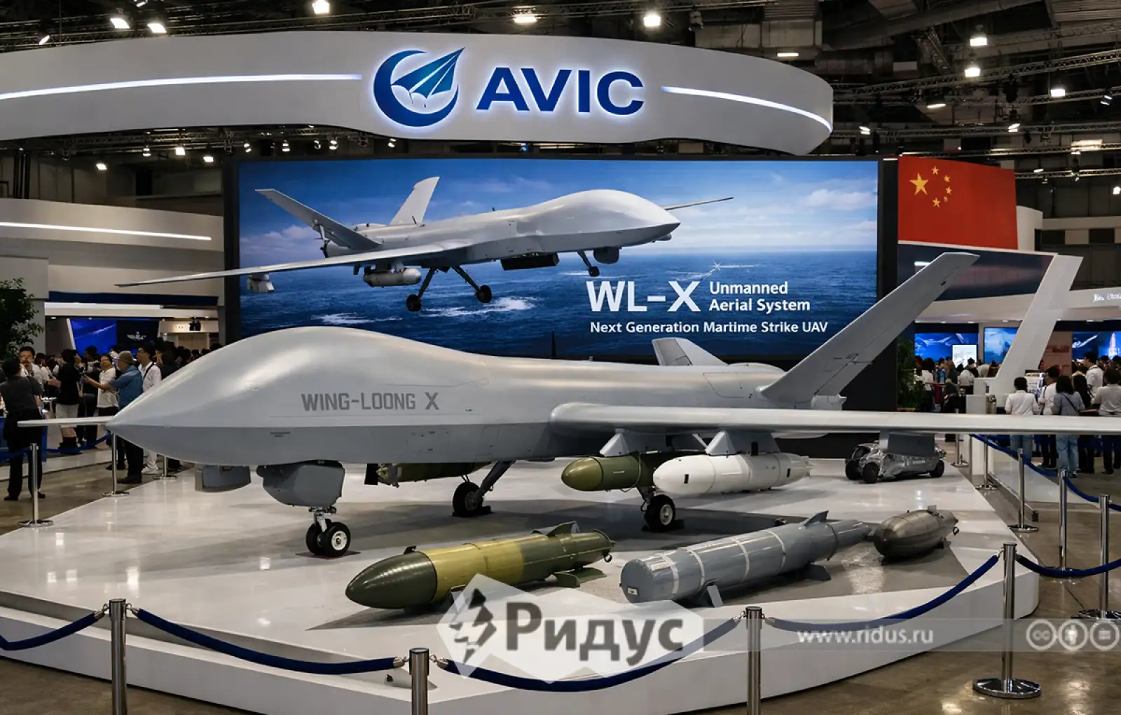 На расположенном в центре выставочного зала огромном стенде ведущего китайского производителя аэрокосмической техники, компании Aviation Industry Corporation of China (AVIC), выставлен макет боевого беспилотника WL-X. Это первая демонстрация в Юго-Восточной Азии новейшей модели БПЛА семейства Wing Loong, предназначенных для морского наблюдения и нанесения ударов.