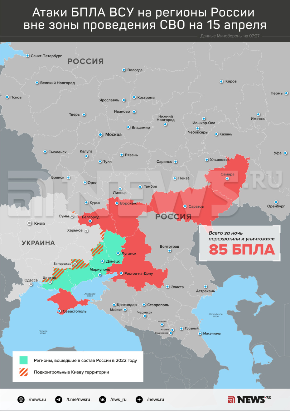 «В течение прошедшей ночи (с 20:00 мск 14 апреля до 07:00 мск 15 апреля) дежурными средствами ПВО перехвачены и уничтожены 85 украинских беспилотных летательных аппаратов самолётного типа над территориями Белгородской, Воронежской, Ростовской, Самарской, Саратовской областей, Республики Крым и над акваториями Азовского и Чёрного морей», — уточнили в оборонном ведомстве.
