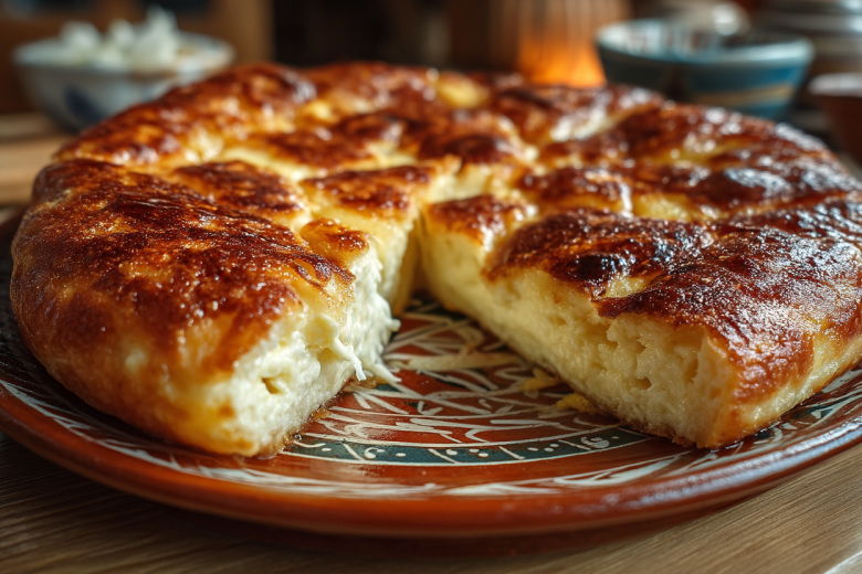 Добавьте яйцо, соль и муку, замесите мягкое, не липнущее тесто. Дайте отдохнуть 15–20 минут. Сыр натрите на крупной терке. Тесто разделите на две части, раскатайте в круглые лепешки. На одну выложите сыр, накройте второй, защипните края, сформируйте пирог. Сделайте небольшое отверстие в центре для выхода пара. Выпекайте в разогретой до 190°С духовке 20–25 минут до золотистого цвета. Готовый пирог смажьте сливочным маслом. Подавайте горячим — он исчезает быстрее, чем вы успеете его нарезать.