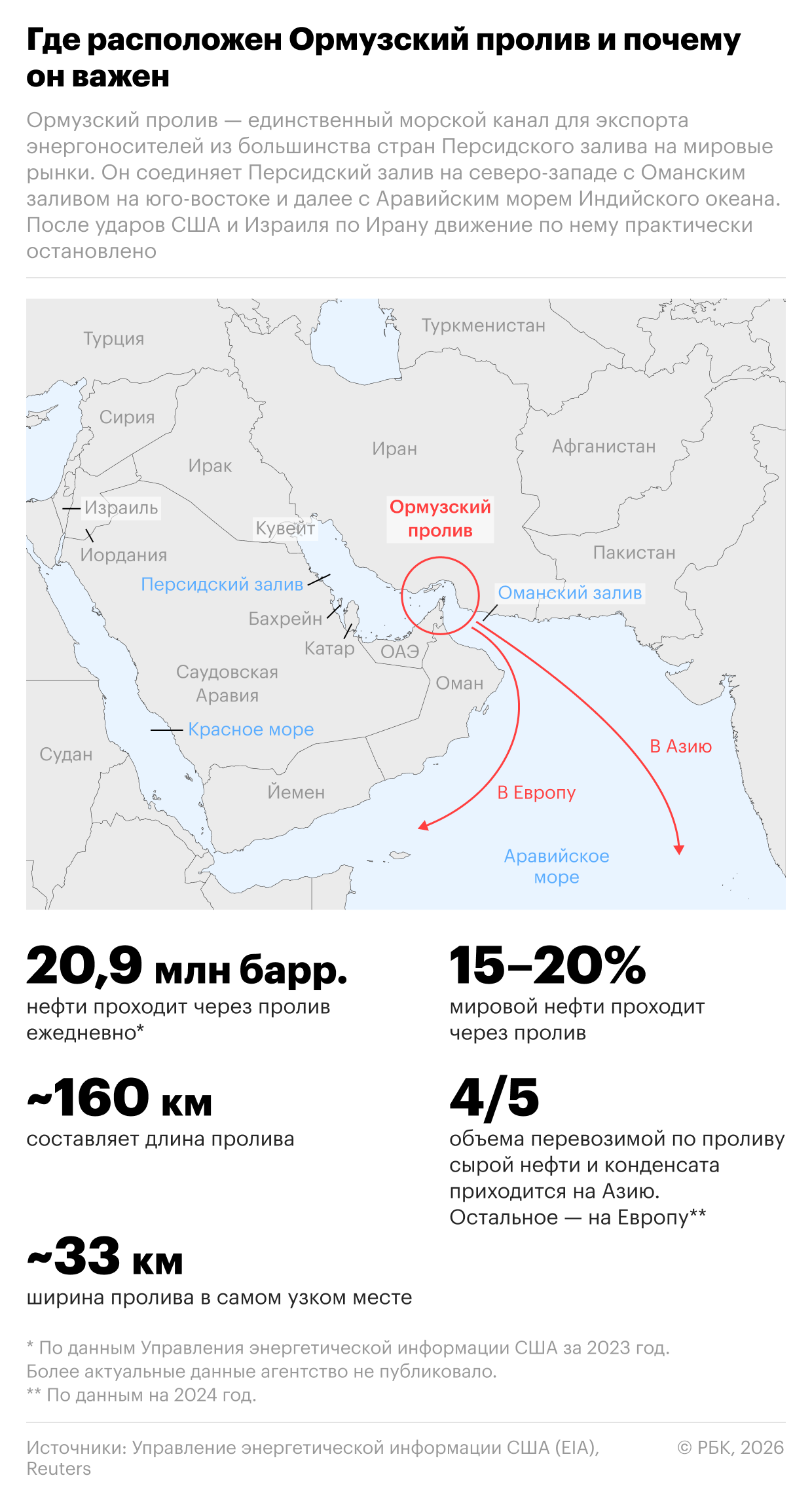 После начала конфликта США и Ирана, а также блокады Ормузского пролива цены на энергоресурсы по всему миру выросли. Из-за обострения геополитической напряженности на Ближнем Востоке на торгах в понедельник, 9 марта, цена нефти Brent влетела к уровню $120 за баррель, что стало максимумом с июня 2022 года. Однако после роста до многолетних максимумов цены на нефть скорректировались. До начала конфликта через Ормузский пролив проходило 15–20% мировой добычи нефти, конденсата и нефтепродуктов и более 30% сжиженного природного газа.